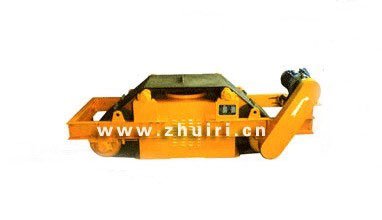 RCDC系列风冷自卸式电磁除铁器,是在RCDA系列风冷悬挂式电磁除铁器的基础上增加了驱动电机、滚筒、带刮板的卸铁胶带等组成的卸铁机构。在工作过程中卸铁机构自动将卸铁皮带上吸附的铁磁性物质跑到除铁器以外的集铁箱内,无需停电人工清理,实现了除铁自动化。