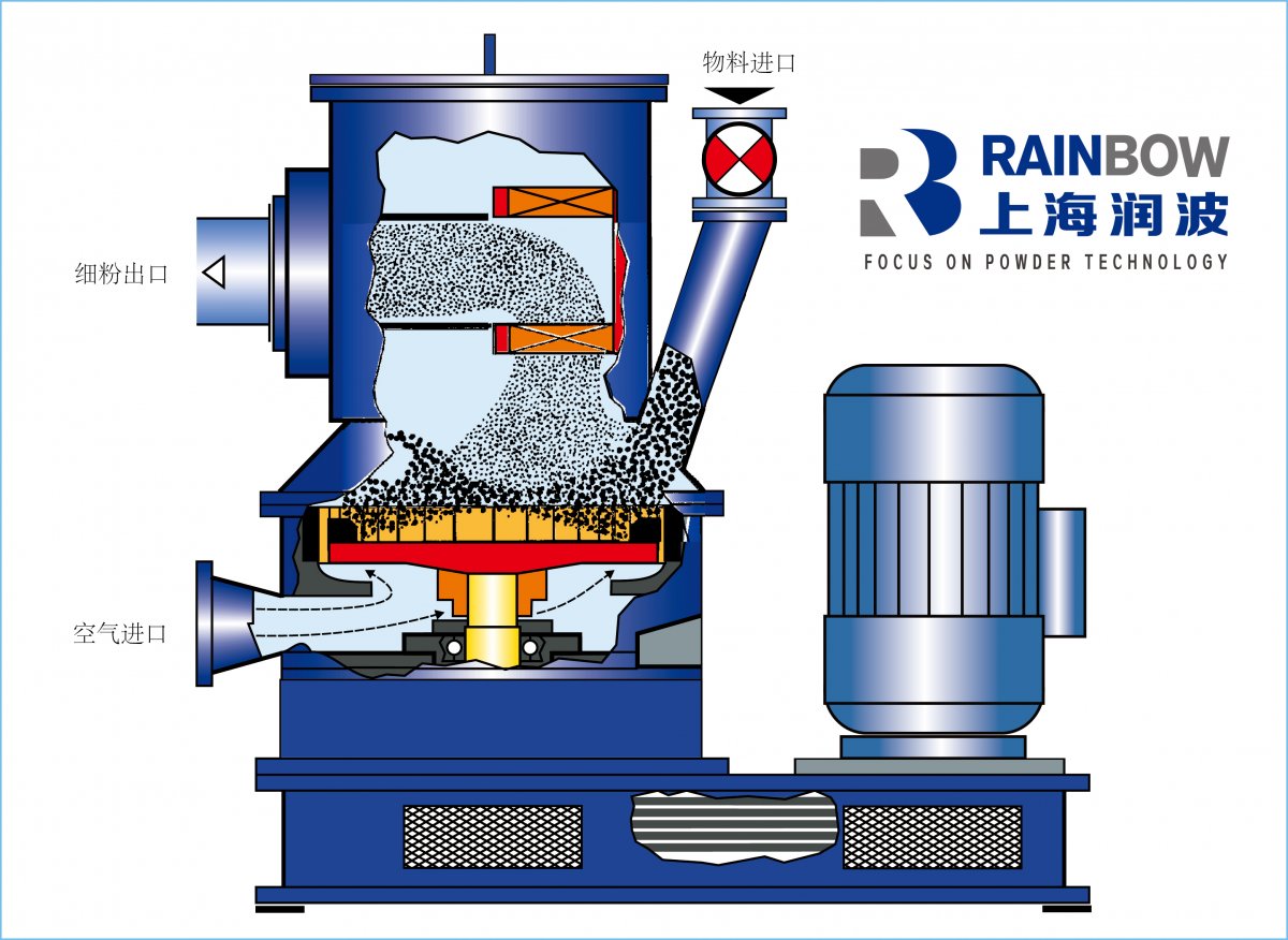 颗粒随着气流上升至分级区,符合要求的颗粒随着气流穿过分级轮进入烟气管道,大的颗粒返回研磨区继续粉碎,直至符合要求。