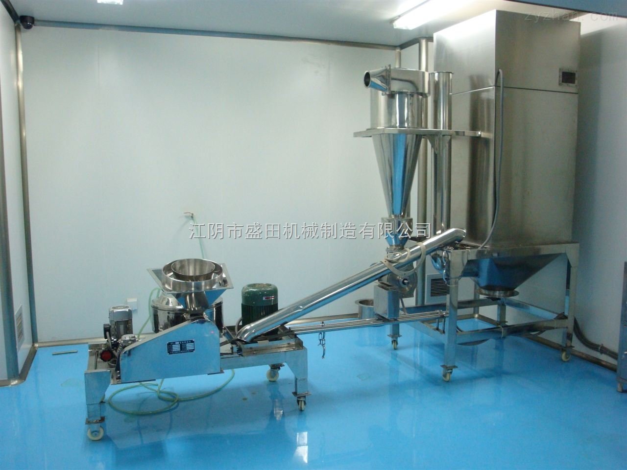 由主机、辅机、电控箱三个部分组成,具有风选式、无筛、无网,粒度大小均匀等多种特点,生产过程连续进行,该机巳达国际先进水平。