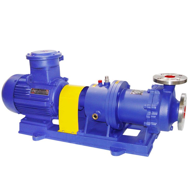 CQB-G高温型磁力泵(简称高温磁力泵)通常由电机,磁力偶合器,水冷却装置,和耐腐蚀离心泵头四大部分组成,其主要特点是利用磁力偶合器传递动力。当电动机带动磁力偶合器的外磁钢旋转时,磁力线穿过间隙和隔离套,作用于内磁钢上,使化工泵转子与电动机同步旋转,无机械接触地传递扭矩。在保温磁力泵的动力输入端,由于液体被封闭在静止的隔离套内,没有动密封因而完全无泄漏。磁力偶合器的磁性材料采用耐高温型稀土永磁材料,能承受300度以下的高温介质而保持强大的磁力扭矩。在电机与磁力偶合器之间加装了水冷却装置,防止泵送高温介质之热量传导至电机,以保持电机的正常运行,从而达到无泄漏输送高温介质。
