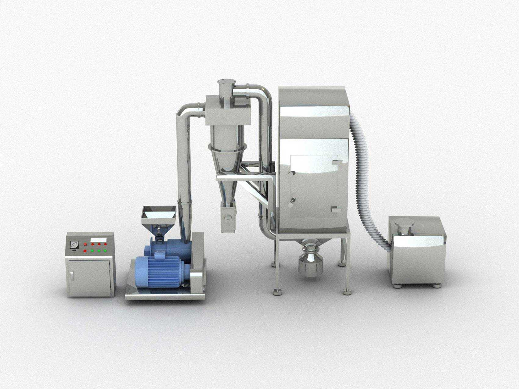 工作原理:该机由加料斗、分级轮、粉碎刀片、齿圈、粉碎电机、出料口、风叶、集料箱、吸尘箱等部分组成。物料由加料斗进入粉碎室,通过高速旋转的刀片进行粉碎,调节分级轮与分级盘的距离来达到所要求的物料细度,高速旋转的风叶把达到要求的物料从粉碎室引到旋风分离器出料,没有达到要求的物料继续在粉碎室中粉碎。旋风分离器的粉尘由脉冲除尘箱收集后回收利用。该机组按“GMP”标准设计,结构简单、操作清理方便、噪音小、产量高、机器全部用优质不锈钢材料制造、粉碎过程中无粉尘飞扬。