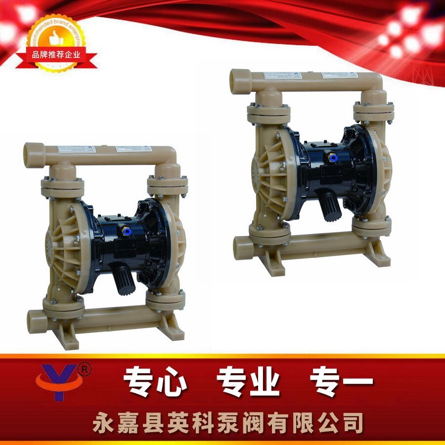 在氟塑料隔膜泵左右各装有一块隔膜,由中心联杆将其连结成一体。压缩空气从泵的进气口进入配气阀,通过配气机构将压缩空气引入其中一腔,推动腔内隔膜运动,而另一腔中气体排出。一旦到达行程终点,配气机构自动将压缩空气引入另一工作腔,推动隔膜朝相反方向运动,从而使两个隔膜连续同步地往复运动。 在图示中压缩空气由进入配气阀,使膜片向右运动,则室的吸力使介质由入口流入,推动球阀进入室,球阀则因吸入而闭锁;室中的介质则被挤压,推开球阀由出口流出,同时使球阀闭锁,防流,就这样循环往复使介质不断从入口处吸入,出口处排出。