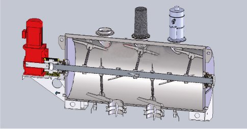 主轴有混合锅体外的两个自定心轴承支撑。主轴和侧板之间的缝隙有迷宫密封加吹气密封加油密封密封组合密封,保证物料不会泄露。
