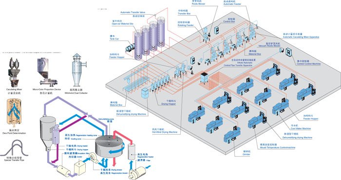该系统主要用于各种塑料粒子输送、仓储、干燥、计量的生产要求,全过程采用PLC集中控制,并在上位机作集中显示。系统可按需方生产工艺要求和厂房现况,合理设计出2000-150000吨/年生产能力的设备。