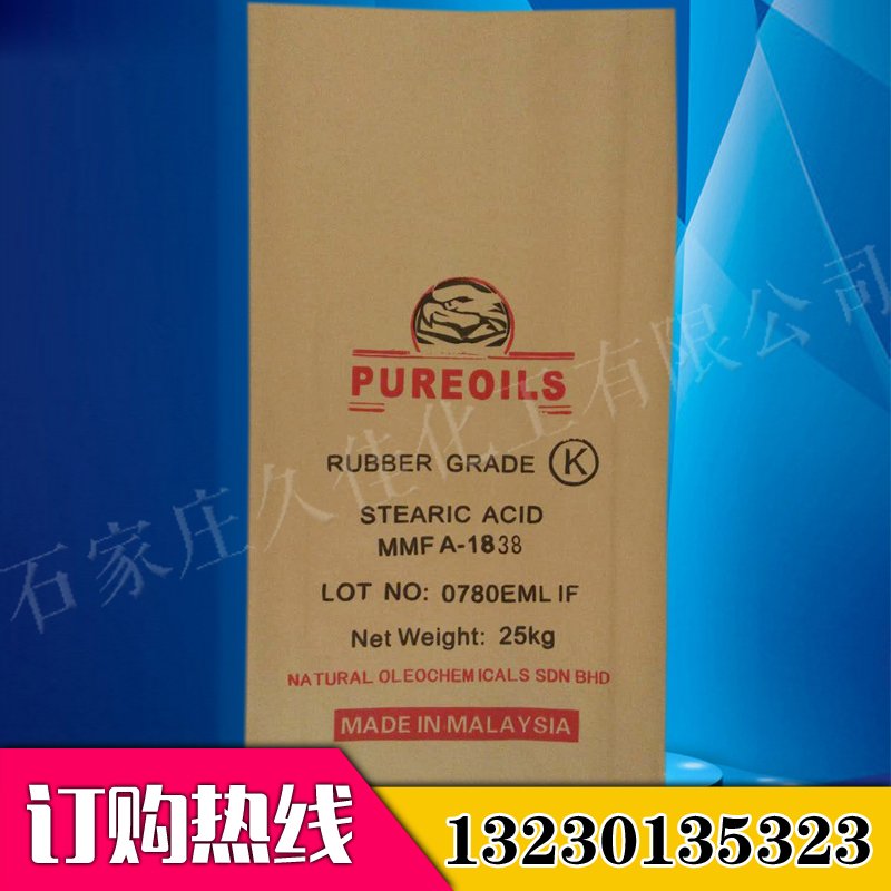 硬脂酸在橡胶的合成和加工过程中起重要作用。硬脂酸是天然胶、合成橡胶和胶乳中广泛应用的硫化活性剂,也可用作增塑剂和软化剂。在生产合成橡胶过程中需加硬脂酸作乳化剂,在制造泡沫橡胶时,硬脂酸可作起泡剂,硬脂酸还可用作橡胶制品的脱模剂。