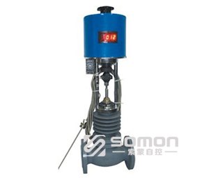 电动温度调节阀由控制阀门、电动执行机构、温度传感器和温度调节器等部件组成,根据用户需要,分别有加热型与冷却型两种结构。加热型调节阀的结构与原理:工作前主阀芯处于半开位置,传感器处于自然状态。接上电源,主阀芯全开。介质由箭头方向流入主阀体、经阀芯对储热箱进行加热。当温度升到相应设定值时,传感器即产生相应线性信号输入一体化执行机构,随即驱动阀杆、阀芯产生位移,关闭主阀芯停止加热。当温度低于设定值时,传感器即产生线性信号输入一体化执行机构,驱使阀芯渐开,使介质按抛物线特性流入储热箱,进行加热直至设定值。这样被控介质始终在设定温度范围内被控制,从而达到控温目的。备注:常说的加热型、冷却型。在此阀中只要更换阀芯结构即可以实现。