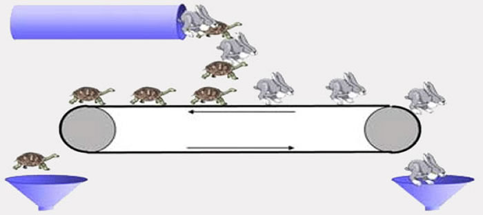 类似龟兔赛跑的原理,我们把固定相必成一个传送带,把兔子乌龟分别必成快慢不同的两组份,只要使固定相加上一个与洗脱方向相反的驱动力,使传送带运动速度处于兔子和乌龟速度中间,跑的快的兔子比固定相快从前头得到,跑得慢的乌龟被传送带带到后面得到。