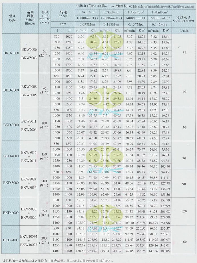● BKD二级风机是由两台BKW风机通过串联组合而成,超越了单台风机的压力极限。一台风机出来的高温气体介质通过中间冷凝冷却,保证进入二级风机的介质的温度不超过规定的温度,从而保证了二级风机的良好运行。 性能表: