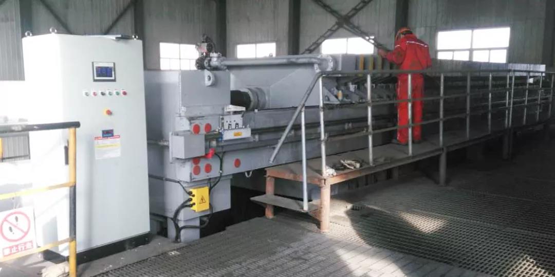 采用景津2000型700平方单室进料压滤机 3台,每个循环50分钟,滤饼水份15-16%。