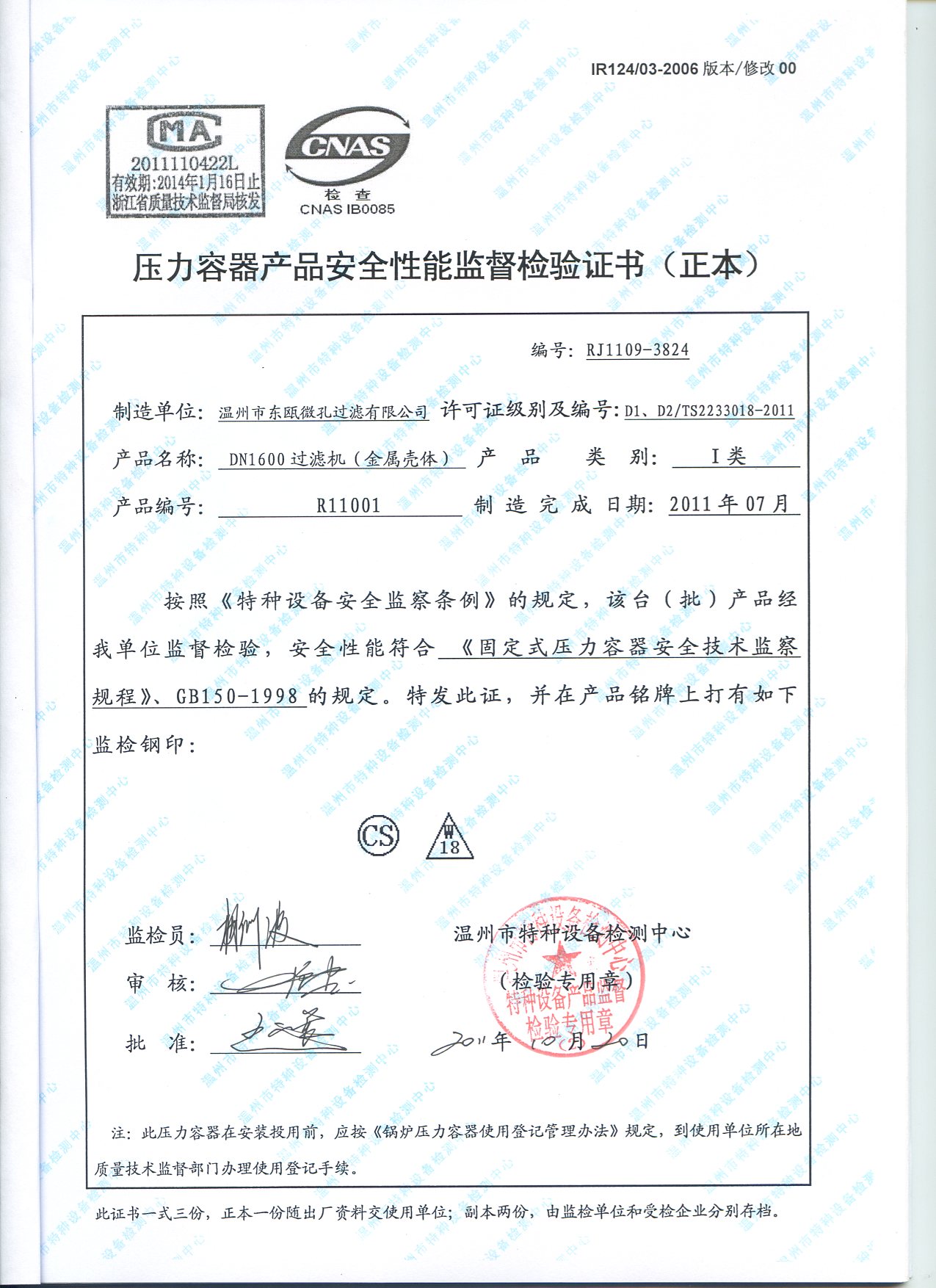 温州市东瓯微孔过滤公司压力容器厂持有D1、D2级压力容器制造资格证书,制造许可证编号:TS2233018-2011。