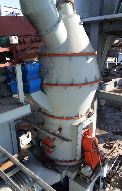电动机通过减速机带动磨盘转动,物料从进料口落在磨盘中央,同时热风从进风口进入磨内,在离心力作用下,物料向磨盘边缘移动,经过磨盘上的环形槽时受到磨辊的碾压而粉碎,粉碎后的物料从磨盘边缘被风环高速气流带起,大颗粒直接落在磨盘上重新粉磨,气流中的物料经过分粒器时,在旋转转子作用下,粗粉落在磨盘上重新粉磨,合格的细粉随气流一起出磨,在收尘装置中收集,即为产品。含有水分的物料在与热气体的接触过程中被烘干,达到所要求的产品水分。