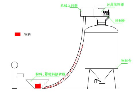机械上料机的驱动电动机螺旋轴上联有空心螺旋,空心螺旋在电动机的驱动下,在高压耐磨塑胶管内高速旋转。当料斗需要上料时,启动电动机带动空心螺旋旋转,原料被螺旋带动形成位移,物料随着位移进行输送,通过旋转产生的离心力把物料抛出排料口,进入收料仓。