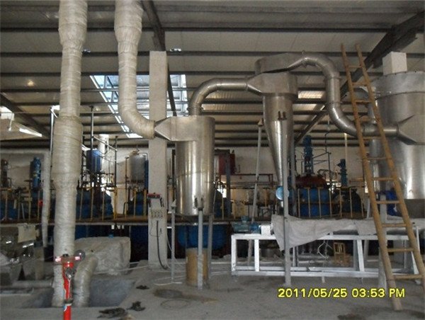 气流干燥机原理: 气流干燥又称瞬间干燥,干燥强度大、设备投资少,气流干燥设备的处理量的蒸发水份能力从 50kg/h-1500kg/h,设备容积小,投资省,是其他干燥设备比不上的。自动化程度高、产品质量好,气流干燥物料全在管道中进行,干燥时间极短(只有0.5-2秒)因此可实现自动化,产品不与外界接触,污染小,质量好。 设备成套供应、热源自由选择:我厂气流干燥设备成套供应,基本型由空气过滤器、加热器、加料器、干燥管、风机、旋风分离器组成。用户可根据需要添置除尘器或其他辅助设备。 在加热方式选择上,气流干燥设备有较大的适应性,用户可以根据所在地区的条件选用蒸汽、电、热风炉加热、同时又可根据物料耐热温度(或热风温度)选择:≤150℃时,可选用蒸汽加热;≤200℃时,电加热(或蒸汽加热,电补偿或导热油加热);≤300℃时,燃煤热风炉;≤600℃时,燃油热风炉。 流程示意图: 工作原理: 湿物料经输送机与加热后的自然空气同时进入干燥器,二者充分混和,由于热质交换面积大,从而在很短的时间内达到蒸发干燥的目的。干燥后的成品从旋风分离器排出,一小部分飞粉由旋风除尘器或布袋除尘器得到回收利用。Q型气流干燥器是负压操作,物料不经过风机;QG型气流干燥器是正压操作;物料经过风机带有粉碎作用;FG型气流干燥器是尾气循环型;JG型气流干燥器是强化型气流干燥器,集闪蒸干燥与气流干燥为一体的新型干燥设备。 技术咨询及试验: 气流干燥是一种批量大、热效率较高的快速连续瞬间干燥设备,虽然其适用于多种物料的干燥,但由于物料性质差异较大,我厂免费技术咨询,提供安装布置图,进行物料试验。 技术参数: 型 号 蒸发水份 (kg/H) 装机功率 (kw) 占地(m2) 高度(m) Q50(正压) 50 6.25(8.25) 20 9 QG50(负压) 50 6.25(8.25) 20 9 JG50(强化) 50 9.25(11.25) 20 9 Q100(正压) 100 8.6(11.6) 32 11 QG100(负压) 100 8.6(11.6) 32 11 JG100(强化) 100 16.1(19.1) 32 11 Q250(正压) 250 20(27.5) 64 16 QG250(负压) 250 20(27.5) 64 16 JG250(强化) 250 31(38.5) 64 16 QG500(负压) 500 33(48) 96 16 Q1000(正压) 1000 63(78) 120 16 QG1000(负压) 1000 63(78) 120 16 JG1000(强化) 1000 78(98) 120 16 注:装机功率一栏括号中为配布装尘器时功率。 干燥举例: 物料名称 进料湿含量(%) 产品湿含量(%) 热风进口温度/℃ 废气排出温度/℃ 产品粒度/目 草酸 4-5 0.5 120 40 20 醋酸钠 10 2-3 80-90 味精 4-5 0.1 100 药用小苏打 3 0.05 110 焦亚硫酸钠 5-6 0.05 100 40 葡萄糖 16-17 9.1 90 40 20目 硬脂酸盐类 40-50 105-200 70-80 200 氟硅酸钠 12 1以下 400 160 苯甲酸 25 0.5 110 60 80 毗脞铜 15 0.6 90-110 55-60 磺化煤 60-70 20-40 250(进口) 硫铵 1.8-2.5 0.02-0.08 100-115 70-90 对氮基酚 10 0.4 240 70 活性炭 205 4 455 熔融磷肥 5 0.3 200 扑热息痛 6-7 0.2 135-140 75-80 40-60 安乃近 20 4-5 100 70 聚甲醛 20 1 135 65 120-150 食用小苏打 3.9 0.2 180-240 50-70 0.005-0.01