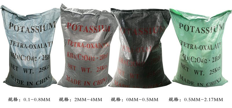 别名: 草酸三氢钾 CAS NO: 6100-20-5 分子式 :KH3(C2O4)2. 2H2O 颗粒度 :0.1mm - 0.8 mm, 0.5 m -2 mm, 0.5 mm- 3 mm, 2mm-4 mm , 2 mm- 15 mm 外观 : 无色颗粒