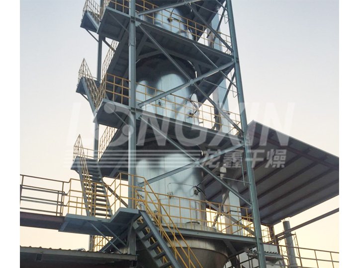 设备将料液压入位于塔体顶部的喷嘴雾化成微小雾滴,同塔顶热风平行而下,大部分粉粒由塔底排料口收集,废气及其微小粉末经旋风分离器分离。