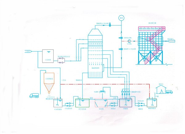 脱硫液采用外循环吸收方式。吸收了SO2的脱硫液流入再生池,与新来的石灰水进行再生反应,反应后的浆液流入沉淀池,当一个沉淀池沉淀物集到一定程度时,然后由污泥泵提出进入压滤机进行有效压滤,废渣晾干后外运处理。循环池内经再生和沉淀后的上清液由循环泵打入脱硫塔循环使用。