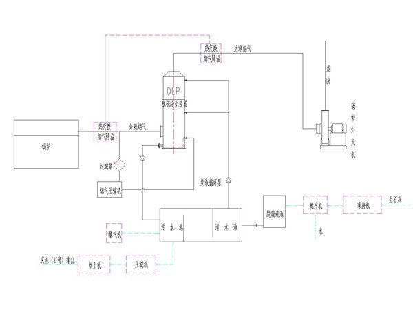 锅炉烟气经布袋或静电除尘后进入吸收塔。在吸收塔内烟气向上流动且被向下流动的循环浆液以逆流方式洗涤。循环浆液则通过喷浆层内设置的喷嘴喷射到吸收塔中,以便脱除SO2、SO3、HCL和HF,与此同时在氧化风机及氧化喷枪的处理下反应的副产物被导入的空气氧化为石膏(CaSO42H2O),并消耗作为吸收剂的石灰石。循环浆液通过浆液循环泵向上输送到喷淋层中,通过喷嘴进行雾化,可使气体和液体得以充分接触。每个泵通常与其各自的喷淋层相连接,即通常采用单元制。