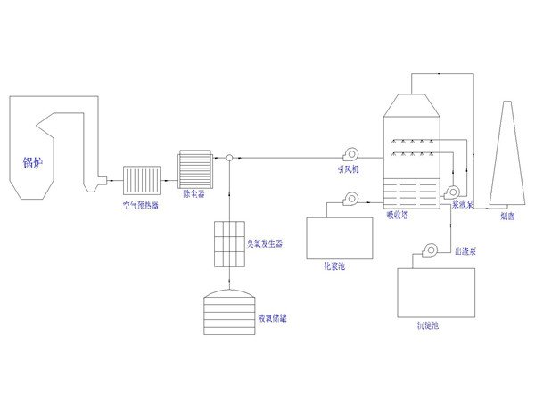 将臭氧注入混合反应装置内,使臭氧与烟气充分混合,将烟气中不溶于水的NO氧化成易溶于水的高价态氮氧化物,包括NO2,N2O3,N2O5,极短的时间内完成反应。然后进入吸收塔,喷淋碱性溶液将烟气中被氧化的氮氧化物吸收,确保NOx排放浓度在200mg/Nm³以下。