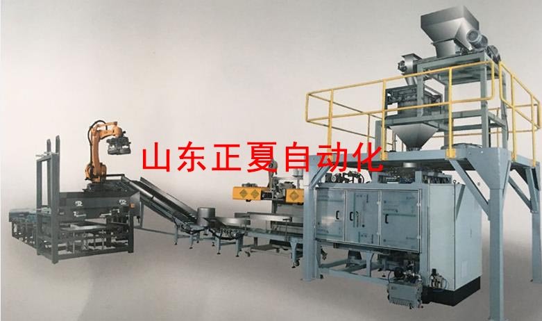 自动套袋——物料称量——填充物料——自动缝包机——输送——机器人码垛