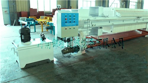 在液压缸的作用下,压滤机滤板沿主梁移动压紧,使相邻滤板间形成滤室,周边密封。煤泥水经人料泵以一定压力从人料孔给人各滤室,借助人料泵的给料压力在过滤介质两侧形成的压力差实现固液分离,煤泥颗粒滞留在滤室内,滤液透过过滤介质从滤板的导水孔排出机外。经过一段时间后,滤液不再流出,过滤脱水过程完成。停止入料,由链条拉开滤板,滤饼脱落后,由压滤机下的刮板输送机或胶带机运走。