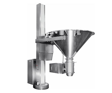 该机由NTF固定提升转料机和ZL整粒机组成。工作时,将锥形料斗与沸腾制粒机或沸腾干燥机的料仓扣合。启动提升按钮,料仓提升;启动翻转按钮,料仓即可翻转180°。松开剎车,水平旋转立柱到工艺要求位置,再下降料仓到工作高度,开启整粒机打开蝶阀,使物料经过整粒后密闭转移到下一工序。