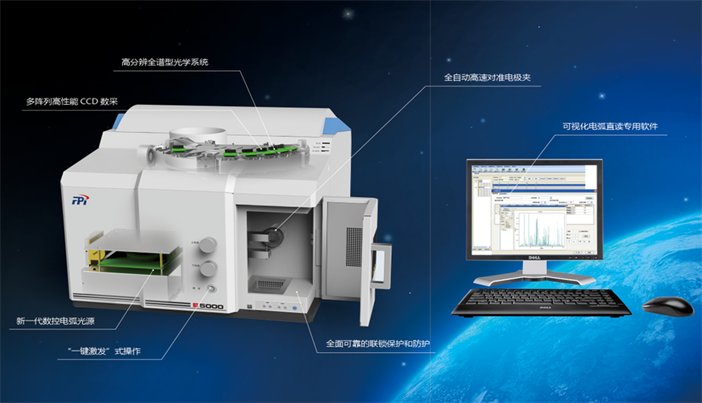 E5000拥有高功率数控电弧光源、全自动激光对准的光源装置、稳定可靠的Paschen-Runge(帕型-龙格)全谱型分光系统以及阵列CCD全谱测量技术,同时结合时序分析、光谱自动校正等技术,并采用固体样品直接进样的方法。解决了传统技术分析繁琐、效率低下、准确性差等问题。使得E5000发射光谱仪具有全谱多元素同时分析、分析速度快、分析准、稳定性好等优点。