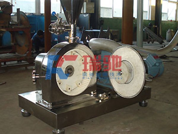物料由加料系统均匀的送入粉碎室受到高速旋转的粉碎盘的强烈冲击,同时受到离心力的作用,与粉碎齿圈发生碰撞,受到剪切、摩擦、碰撞等多种综合力的作用,使物料粉碎,被粉碎的物料随气流运动到分级区,通过变频调节的分级轮,对粗细物料进行分离,符合细度要求的产品随气流进入旋风收集器和除尘器收集,粗物料返回分级区二次粉碎。