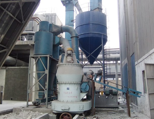 大块状物料经颚式破碎机破碎到所需粒度后,由提升机将物料送至储料斗,再经皮带秤将物料精确均匀地送入主机磨室内进行研磨。粉磨后的粉子随风机气流上升,经选粉机进行分级,符合细度的粉子随气流经管道进入旋风收集器内,进行分离收集,经出粉阀排出即为成品粉子。气流由旋风集粉器上端回风管吸入离心引风机,一部分进入气箱脉冲收尘器,由于收尘风机的作用使整个气流系统在负压状态下循环工作。