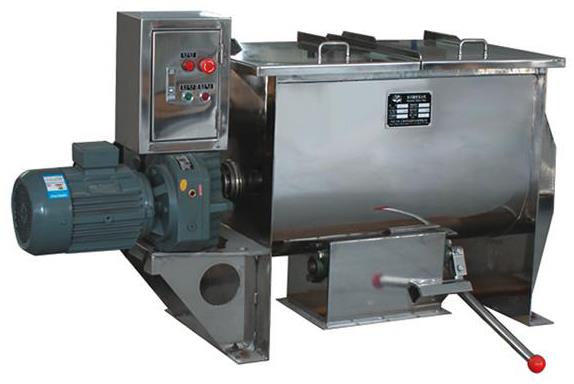 由U形容器、螺带搅拌叶片和传动部件组成;U形的长体筒体结构,保证了被混合物料(粉体、半流体)在筒体内的小阻力运动。正反旋转螺条安装于同一水平轴上,形成一个低动力高效的混合环境,螺带状叶片一般做成双层或三层,外层螺旋将物料从两侧向中央汇集,内层螺旋将物料从中央向两侧输送,可使物料在流动中形成更多的涡流。加快了混合速度,提高混合均匀度;