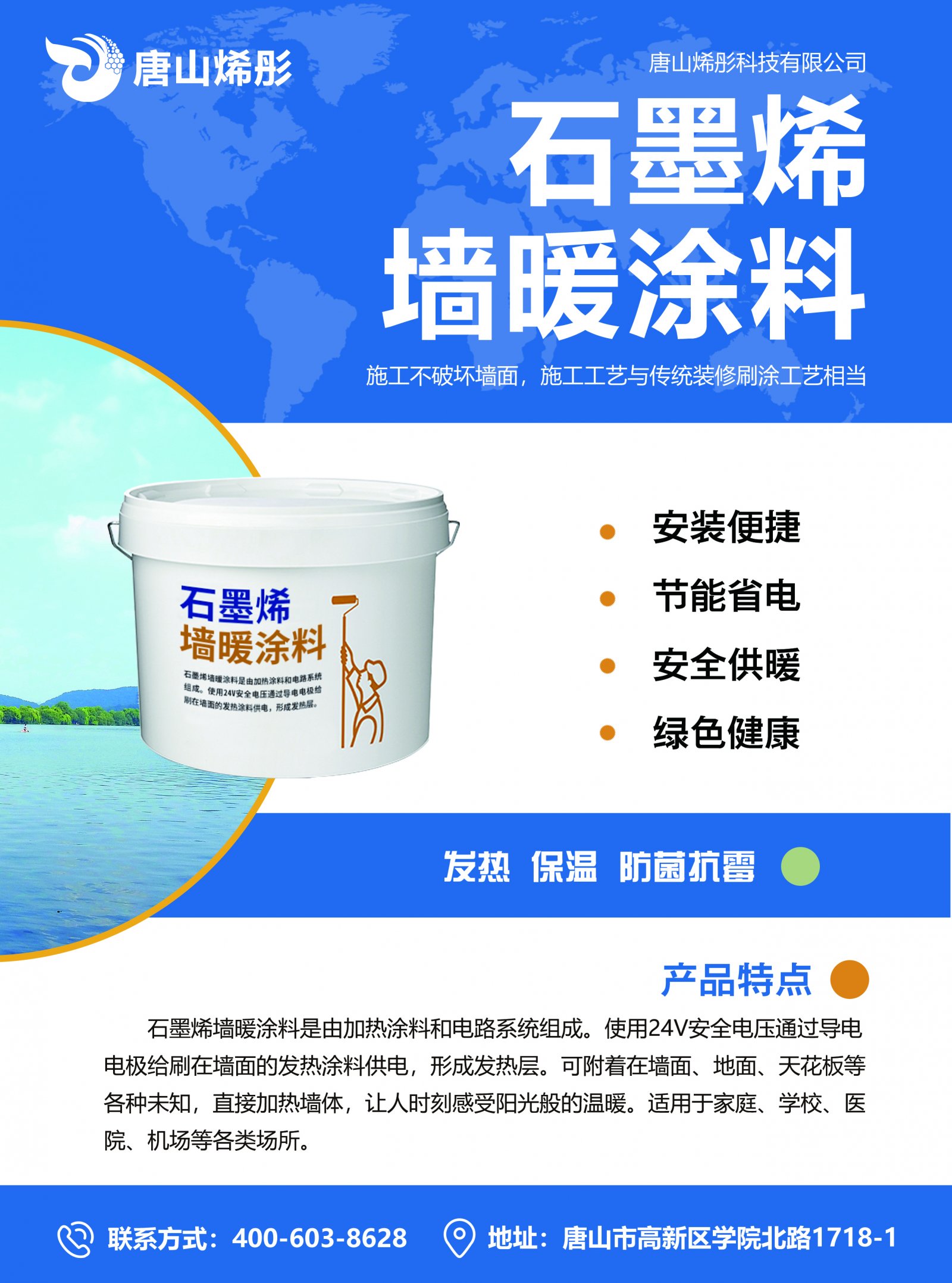 (一)施工不破坏墙面,施工工艺与传统装修刷涂工艺相当,施 工简单便捷、不影响既有装修风格,石墨烯碳导电浆料经刷涂自然干 燥后,可按照刮涂腻子、涂刷面漆等传统工艺施工。 (二)施工成本低,相对于传统的集中供暖,每平米需要消耗 A 实景图 B 实景图 C 温度实测图 D 渲染效果图10~20 公斤的钢、铁、铜等辅助材料,墙面电暖系统平均 100 平方米 只需要 5~6 公斤石墨烯碳基导电浆料和 4~5 公斤的其他器材辅件,用 料更少,效果更好。 (三)节省空间,发热区域施工于墙体表面,厚度仅为0.1~1mm, 不占用室内其他空间,不影响整体布局,位置选择灵活。 (四)自然辐射模拟阳光,远红外健康效果,发热涂层可发射大 量的远红外光波,其法向全发射率达到 0.83,波长范围主要集中在 8~15 微米,占比超过 70%,与生物体能够吸收的远红外波段相同, 具有显著的健康效益。 (五)更安全,墙面发热系统采用 12V、24V、36V 特安全电压 供电,人体可以直接触摸,无触电风险,无电磁波辐射,对有老人孩 子的家庭更安全。 (六)快速升温,取暖效果好,属低温大面积采暖方式,发热温 度 50~60℃可调,温度场均匀,可智能控制,随用随开,开机即热, 无噪音、不干燥,体感舒适。 (七)节能效果明显,发热涂层有效电热转换效率可达到 95%以 上,比传统合金丝加热方式效率提高约 25%,同等条件下,耗电量约 仅为空调取暖的 1/3。 (八)绿色无污染,石墨烯碳基导电浆料为水性环保型浆料,不 含甲醛、苯系等挥发物,产品无毒性,在供暖过程中不会有传统采暖 产生的二氧化硫、一氧化碳的有害气体,相关第三方环境检测正在进 行中。(九)零维护、低维护,发热涂层附着力好,表面细腻、致密度 高、薄厚均匀,正常使用下寿命可达 30000 小时,耐潮、耐湿、耐刺 穿,只要基础元件不损坏,发生轻微破损情况下不影响整体使用功能。