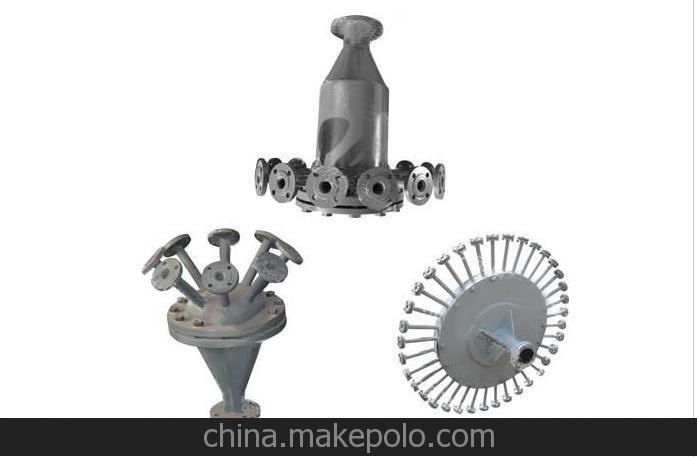 一、产品描述:煤粉分配器是高炉喷吹煤粉系统中主导煤粉向高炉风口平均分配输送的重要设备。一般来说煤粉分配器的种类按外形分主要有瓶式、球式、盘式、锥式、扬角式,按支管材质分有耐磨合金式、耐磨陶瓷式等煤粉分配器。现在大部分钢厂应用的是锥式煤粉分配器,与瓶式、球式、盘式分配器相比,具有阻力小、分配均匀性好等特点。为提高分配器的使用寿命,煤粉分配器采用了多种耐磨材料,如锥体采用耐磨堆焊、支管进口嵌装硬质合金管头、支管采用内衬陶瓷等。在设计上,针对它们主管和各支管的直径的确定,分配器高度,分配支管个数确定以及对于设计的煤粉分配器在分配精度上得到保证。煤粉分配器,包括壳体,壳体顶部 安装端盖,端盖底面与旋流锥体连接,壳体上部外周安装喷煤管,喷 煤管内壁是曲面。