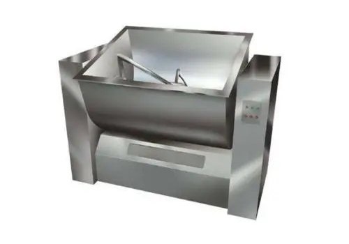 槽型混合机是通过电机减速机机组带动穿过料斗的主轴使S型的搅拌桨旋转,带动物料径向轴向翻动往复掺混,达到物料的均匀混合。机械搅拌器的运动部件在旋转时也会对液体产生剪切作用,液体在流经器壁和安装在容器内的各种固定构件时,也要受到剪切作用,这些剪切作用都会引起许多局部涡流扩散。搅拌引起的主体对流扩散和涡流扩散,增加了不同液体间分子扩散的表面积减少了扩散距离,从而缩短了分子扩散的时间。若待混液体的粘度不高,可以在不长的搅拌时间内达到随机混合的状态;若粘度较高,则需较长的混合时间。