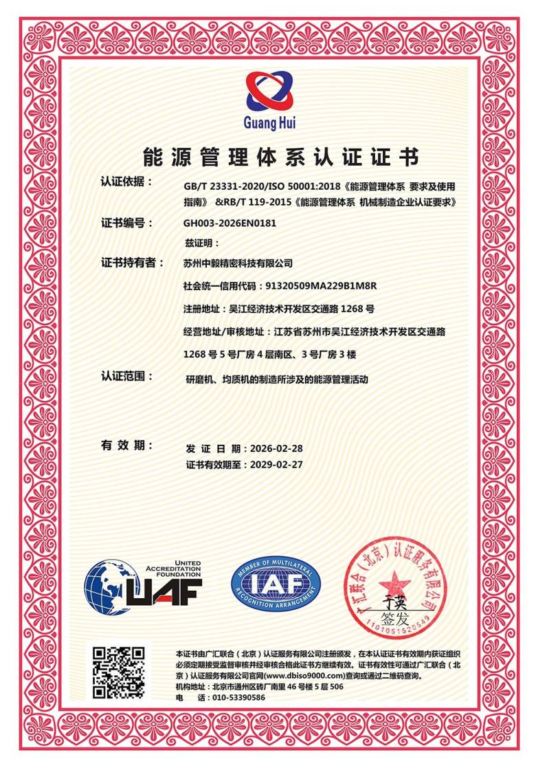 近日,苏州中毅科技科技有限公司(以下简称 “中毅科技”)成功通过广汇联合(北京)认证服务有限公司审核,正式取得GB/T 23331-2020/ISO 50001:2018 能源管理体系认证证书,认证范