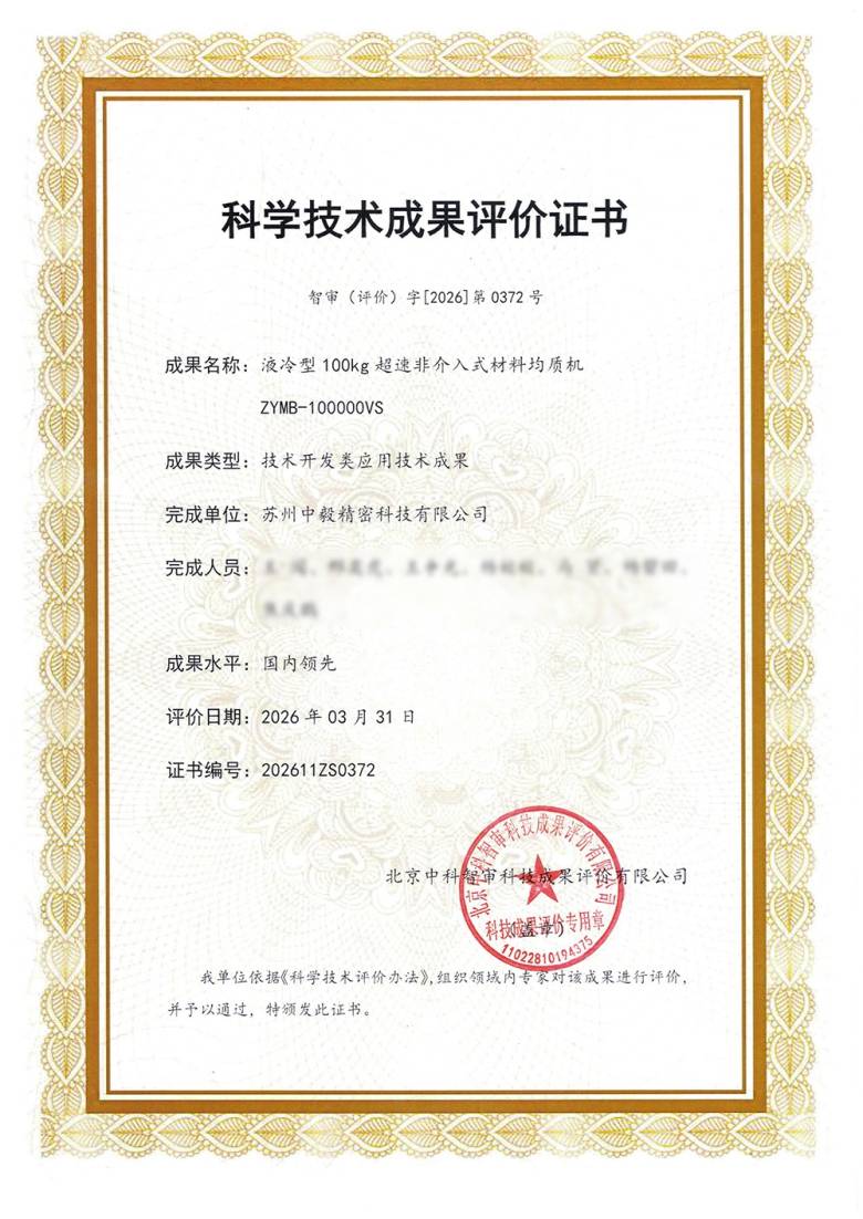 近日,苏州中毅精密科技有限公司(以下简称 “中毅科技”)连获两项权威认证:自主研发的液冷型 100kg 超速非介入式材料均质机(ZYMB-100000VS)获评 “国内领先” 技术成果;三辊研磨机/&
