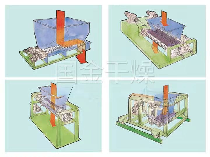 ◎槽形成型机: 由加料斗和刻有槽的二根辊子构成。以增大物料表面积的造粒为目的。物料被内侧运转的辊子吸入,被反转的外侧刮刀切成粒状。