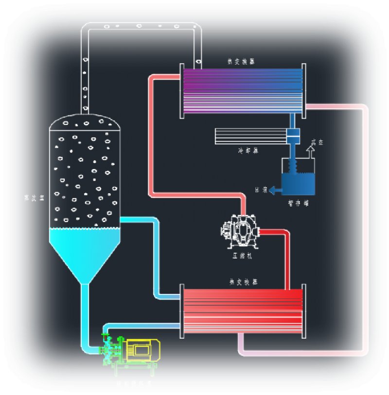 包括贮液罐(用户自备)、预热器、冷凝器、蒸发器、蒸发室、汽液分离器、真空泵(用户自备)、压缩机、过程泵等,蒸发机组各部件通过管道连接,利用压缩机驱动制冷工质在闭合循环过程释放和吸收的能量作为原料蒸发和二次蒸汽冷凝所需能量,也即制冷工质冷凝时释放的能量作为原料蒸发时吸收的能量,原料蒸发产生的二次蒸汽冷凝时释放的能量作为制冷工质蒸发时吸收的能量。系统通过制冷工质吸热放热不断进行热力循环,实现原料蒸发浓缩及二次蒸汽的冷凝。在整个闭合工艺中,系统内制冷工质和物料通过相态转化实现能量的相互充分利用。