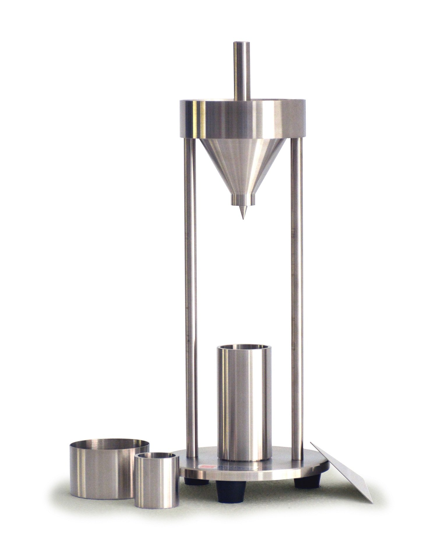 ● 倒入样品:把空量杯放到天平上清零后放到测试仪下方平台指定区域内,再将阻塞棒垂直插放到漏斗中堵住流出口,把待测粉体倒入测试仪器上方漏斗中。