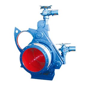 电动扇形盲板阀主要由左阀体、右阀体、丝杠副、翻板、密封圈、杠杆、液压油缸等零件组成,并由底座、支撑柱构成一个刚性结构体。阀门中没有夹紧油缸和翻板油缸,夹紧油缸通过杠杆副和丝杆螺旋副驱动左、右阀体完成松开、夹紧动作,翻板油缸驱动翻板完成开关动作。橡胶密封圈镶嵌在翻板上,具有耐高温、密封性能好、更换方便、使用寿命长等特点。