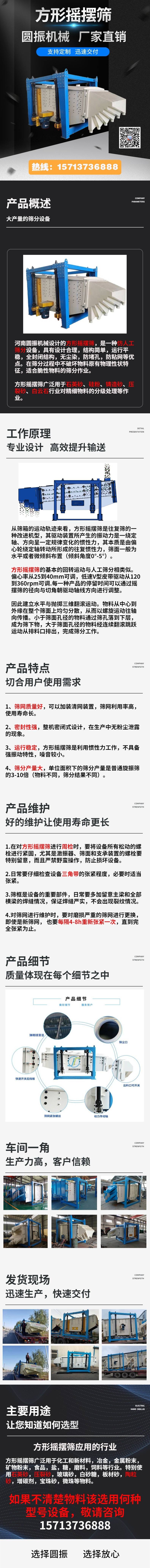 方形摇摆筛是由进出料口筛网筛箱、振动源及减震器三大部件构成。机座与筛箱连接有4-6组软橡胶减震器上下固定,开机即产生离心力,振幅有偏心块、减震器对应控制,从而达到需要的好工作性能,使物料有一个抛震和松动的过筛过程。广泛适用于制药、食品、化工、冶金、电子等行业筛选的理想设备。