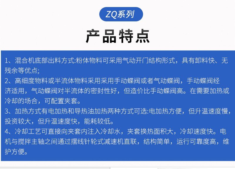 卧式螺带混合机,广泛应用于腻子膏、真石漆、干粉、腻子、医药、食品、化学品、饲料、陶瓷、耐火材料等固-固(即粉体与粉体)、固-浆(即粉体与胶浆液)的混合,特别适应粘稠的物料混合。对纤维含量较大、密度差异大的物料混合,该混合机不适合。腻子膏、真石漆、生物、医药、食品等行业,建议使用不锈钢材质。一般情况下,混合含有玻化微珠的干粉砂浆料,推荐卧式螺带混合机快。电机与搅拌主轴之间通过摆线针轮式减速机直联,结构简单,运行可靠度高,维护方便。