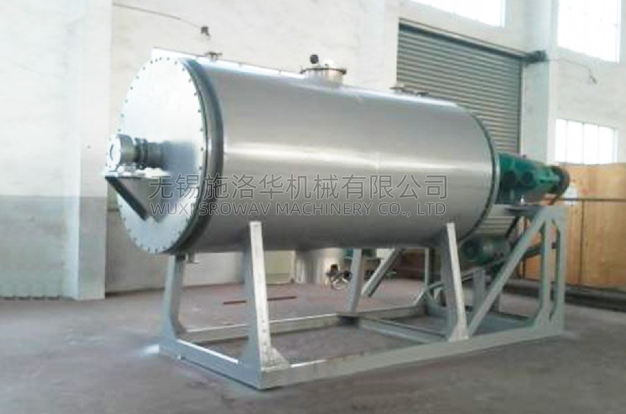 本机是一种新颖卧式间歇式真空干燥设备,湿物料经传导蒸发,带有刮板搅拌器不断清除热面上的物料,并在容器内推移形成循环流,水份蒸发后由真空泵抽出。