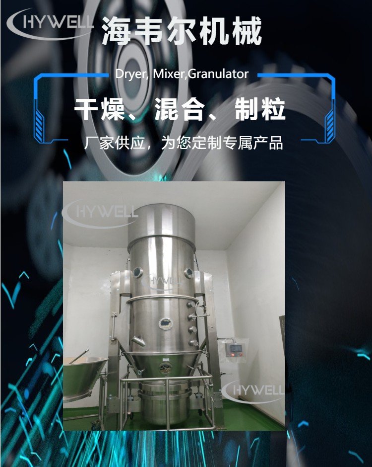 FL沸腾干燥制粒机:物料粉末粒子,在原料容器(流化床)中呈沸腾流化状态,受到经过净化后的加热空气预热和混合,将粘合剂溶液雾化喷入,使若干粒子聚集成含有粘合剂的团粒,由于热空气对物料的不断干燥,使团粒中水份蒸发,粘合剂凝固,此过程不断重复进行,形成理想的、均匀的多微孔球状颗粒。