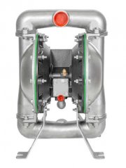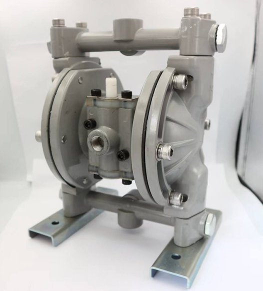 本泵由左右两组隔膜将左右两气室及介质输送腔隔开。当换向阀的阀芯在右边位置时,压缩空气进入左气室,同时右气室内压缩空气排出。随着左气室内压力增大,左边隔膜向左挤压,使左输送腔内压力增大,腔内介质通过单向阀向上输送,由出口排出,右输送腔单向阀关闭。而后换向阀的阀芯向左移动,开始下一次输送过程,循环往复,从而达到输送介质的工作目的。