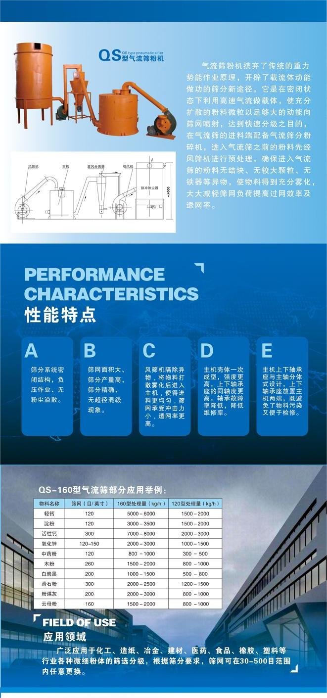 1.高效:筛机效率高,产量大。例如160机120目轻钙班产可达30吨;