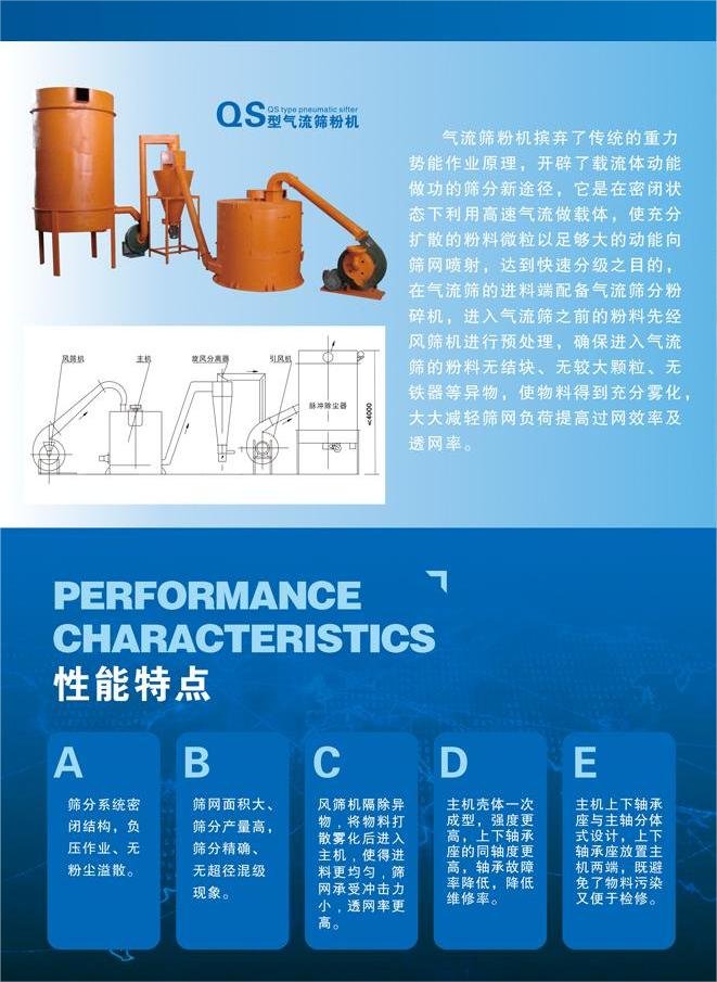 气流筛粉机摈弃了传统的重力势能作业原理,开辟了载流体动能做功的筛理新途径,它是在密闭状态下利用高速气流做载体,使充分扩散的粉料微粒以足够大的动能向筛网喷射,达到快速分级之目的,在气流筛的进料端配备气流筛分粉碎机,进入气流筛之前的粉料先经风筛机进行预处理,确保进入气流筛的粉料无结块、无较大颗粒、无铁器等异物,使物料得到充分雾化,大大减轻筛网负荷提高过网效率及透网率。