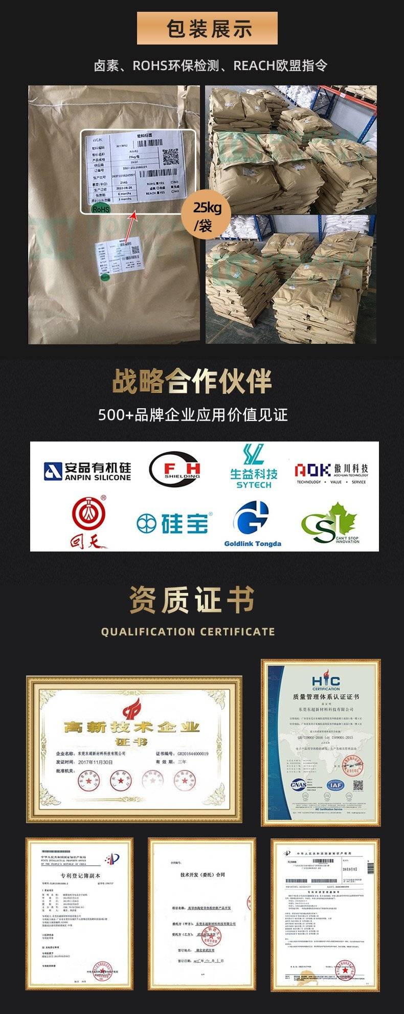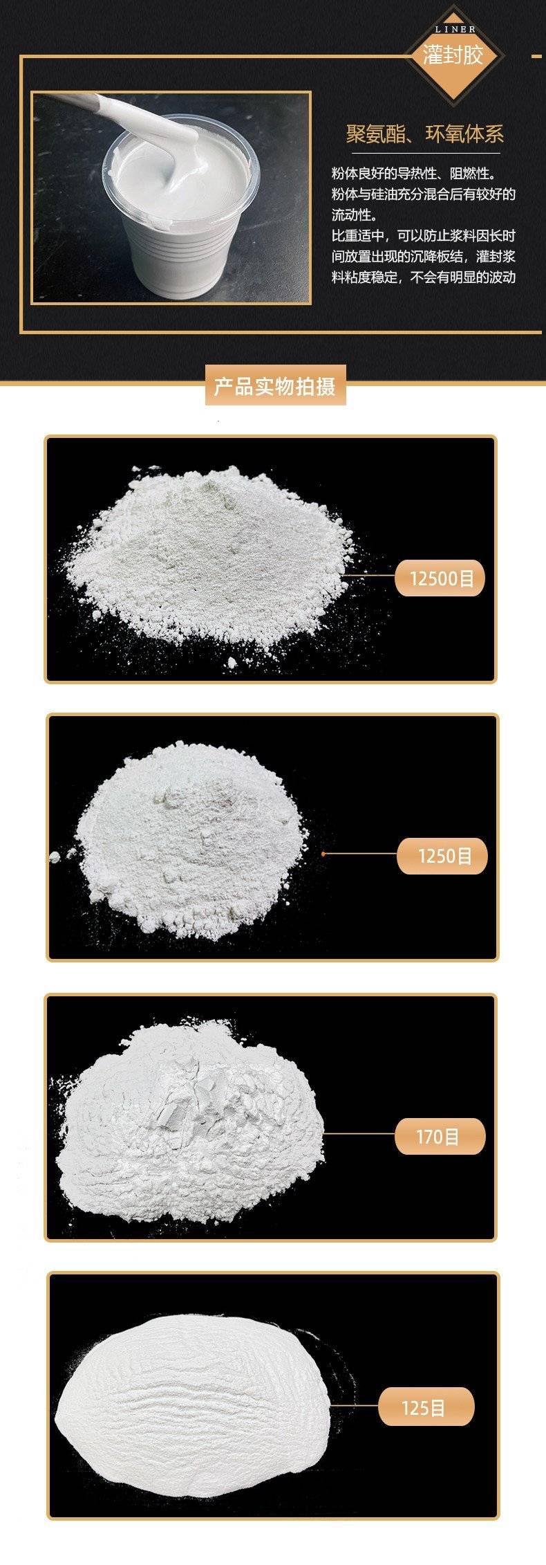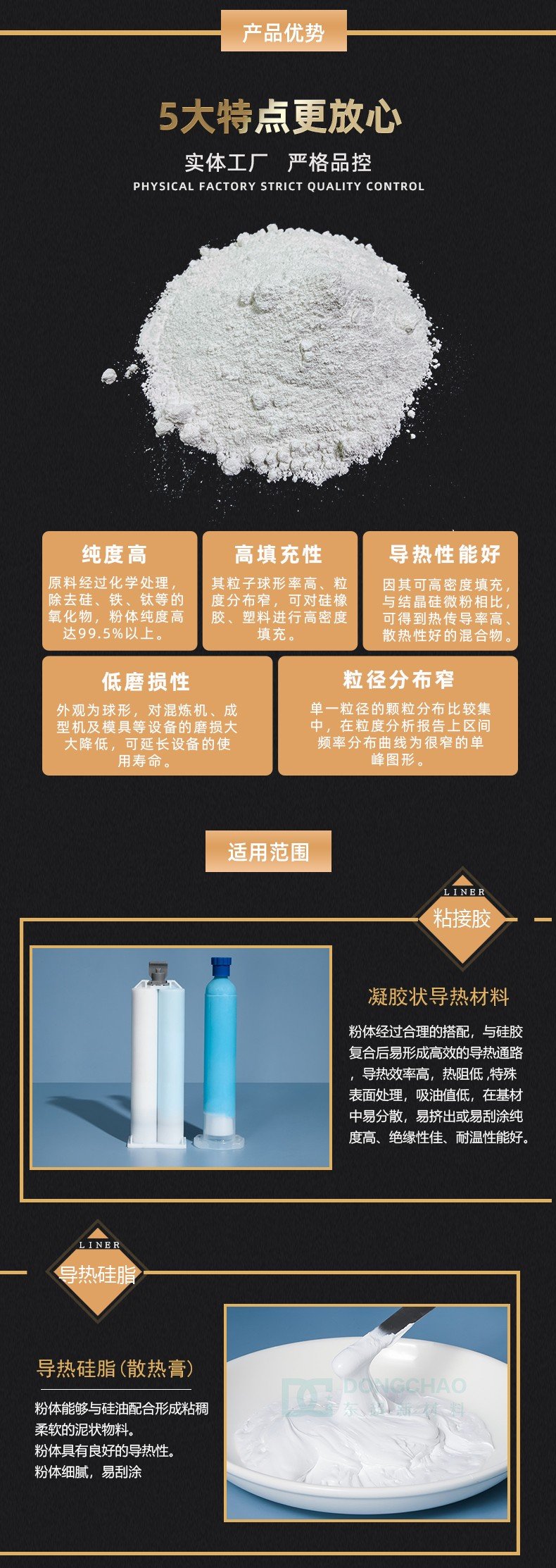 其粒子球形率高、粒度分布窄,可对硅橡胶、塑料进行高密度填充,可得到粘度低、流动性较好的混合物。