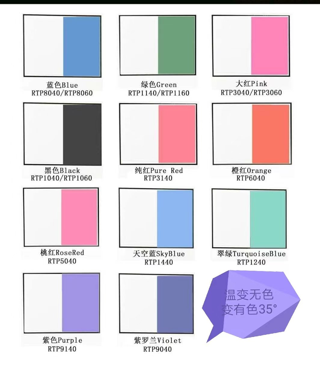 2、温变粉建议用量:网版印刷 10%-30%,塑料射出 0.3% -2%。