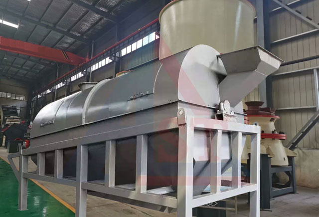 圆筒筛的工作部分为圆筒形,整个筛网围绕圆筒轴线旋转,轴线一般以较小的倾角安装。物料从圆筒小端进料,细粒物料通过圆筒工作面的筛孔,粗粒物料从圆筒的另一端排出。