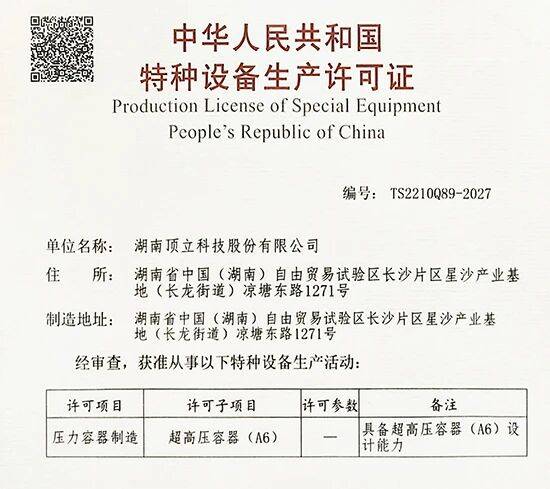 2025年12月,顶立科技成功取得超高压容器(A6)制造资质,且具备超高压容器(A6)的设计资质,标志着公司在高端装备制造领域又迈出了关键的一步。超高压容器是指设计压力≥100MPa的特种设备容器,属