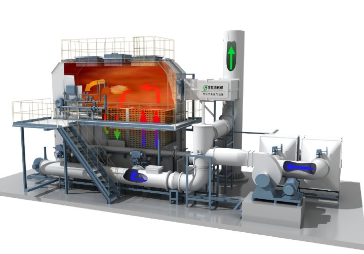 在氧化室中,有机废气再由燃烧器加热升温至设定的氧化温度760℃,使其中的VOC成分分解成二氧化碳和水。由于废气已在蓄热室内预热,燃料耗量大为减少。氧化室有两个作用:一是保证废气能达到设定的氧化温度,二是保证有足够的停留时间使废气中VOC充分氧化。 废气在氧化室中焚烧,成为净化的高温气体后离开氧化室,进入蓄热室2(在前面的循环中已被冷却),放热降温后排出,而蓄热室2吸收大量热量后升温(用于下一个循环加热废气)。净化后的废气经烟囱排入大气,同时引小股净化气清扫蓄热室3。排气温度比进气温度高约40℃左右。